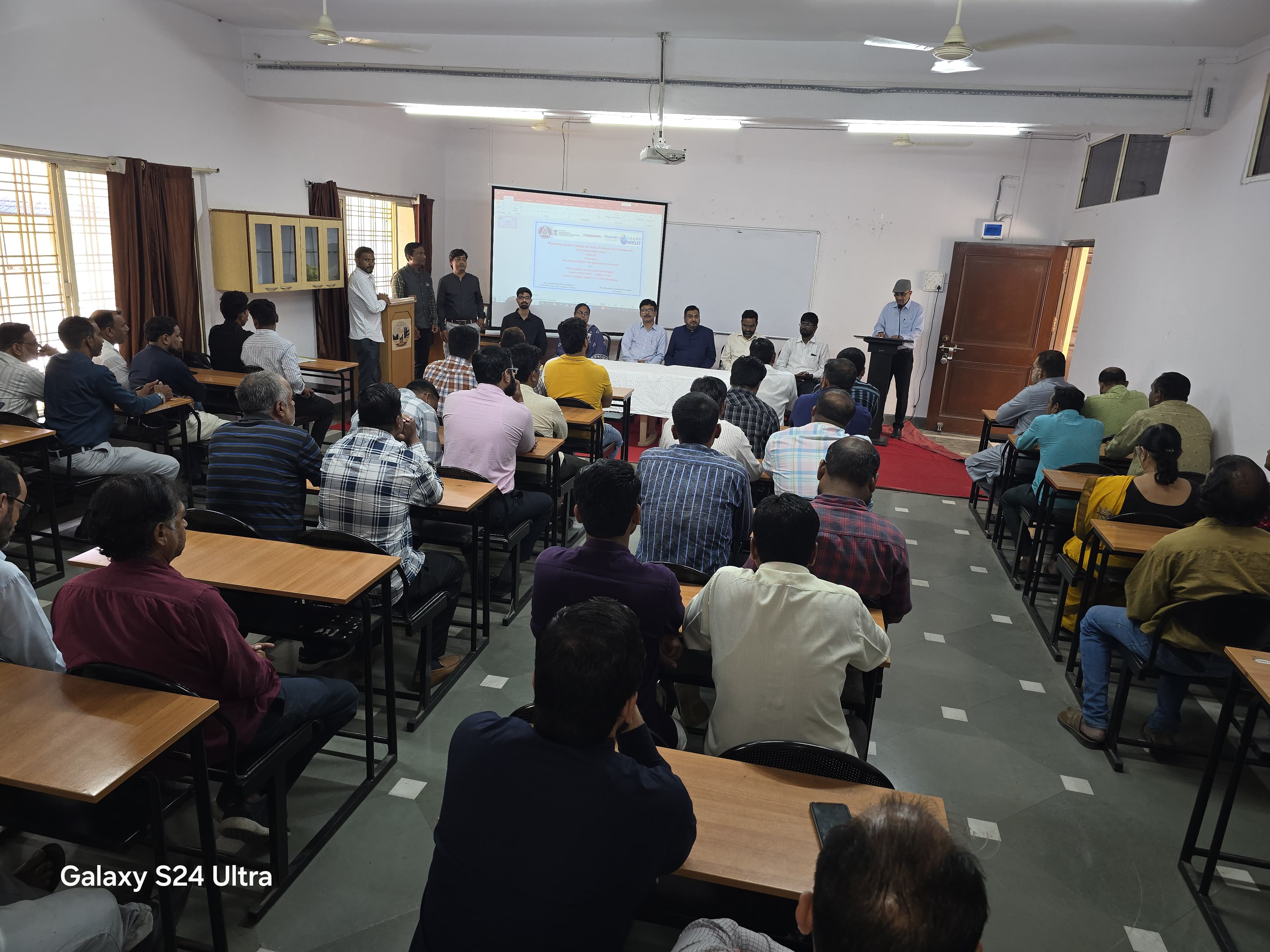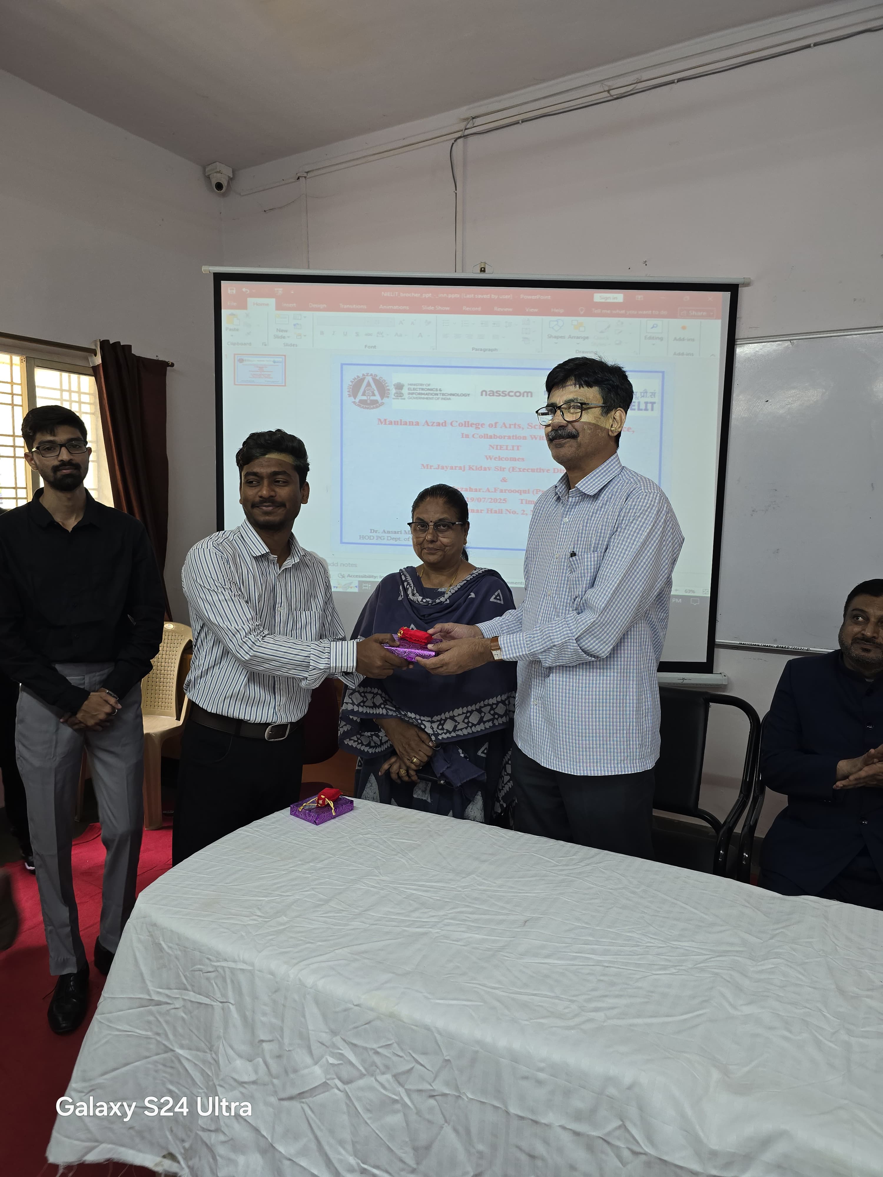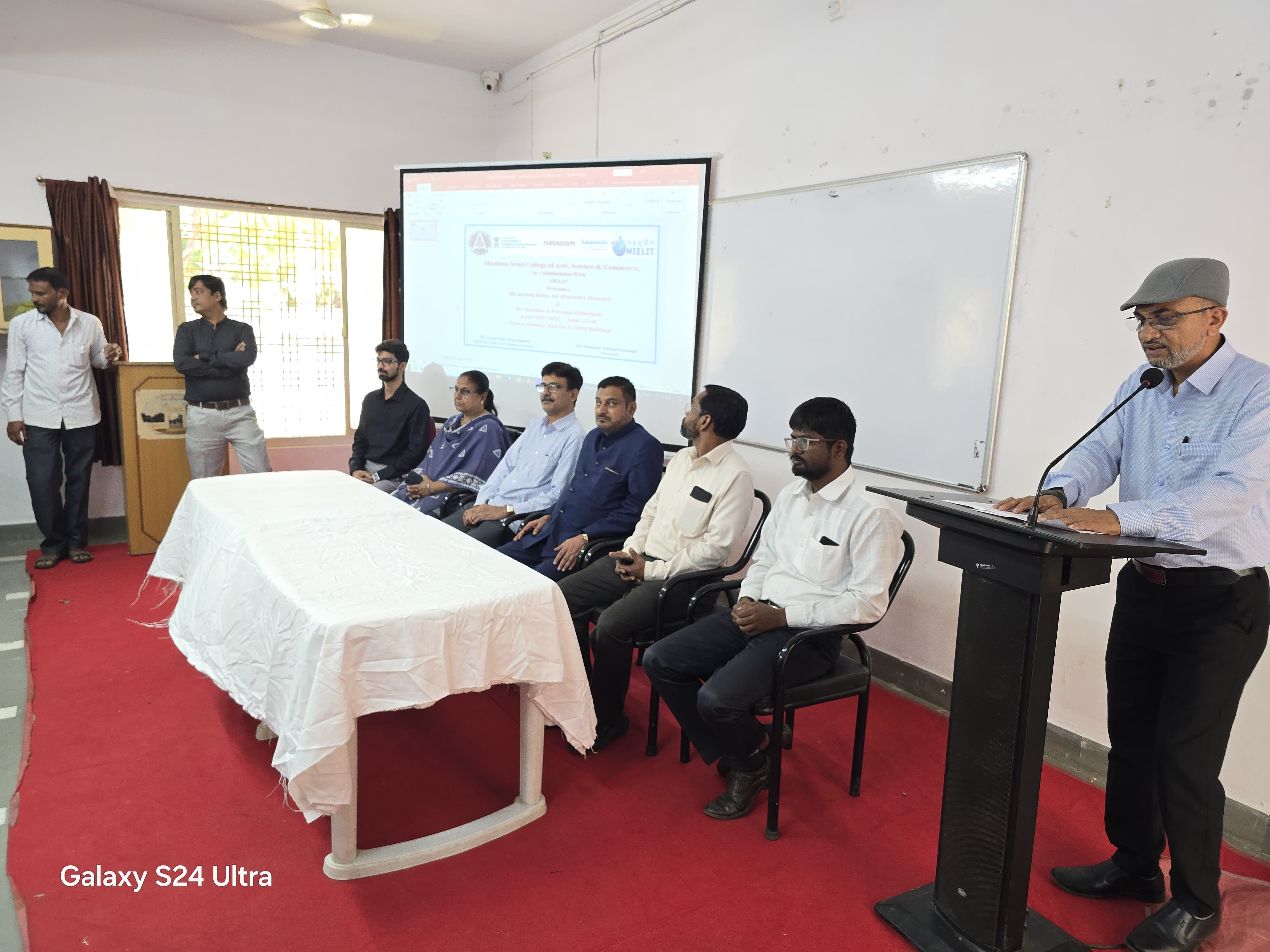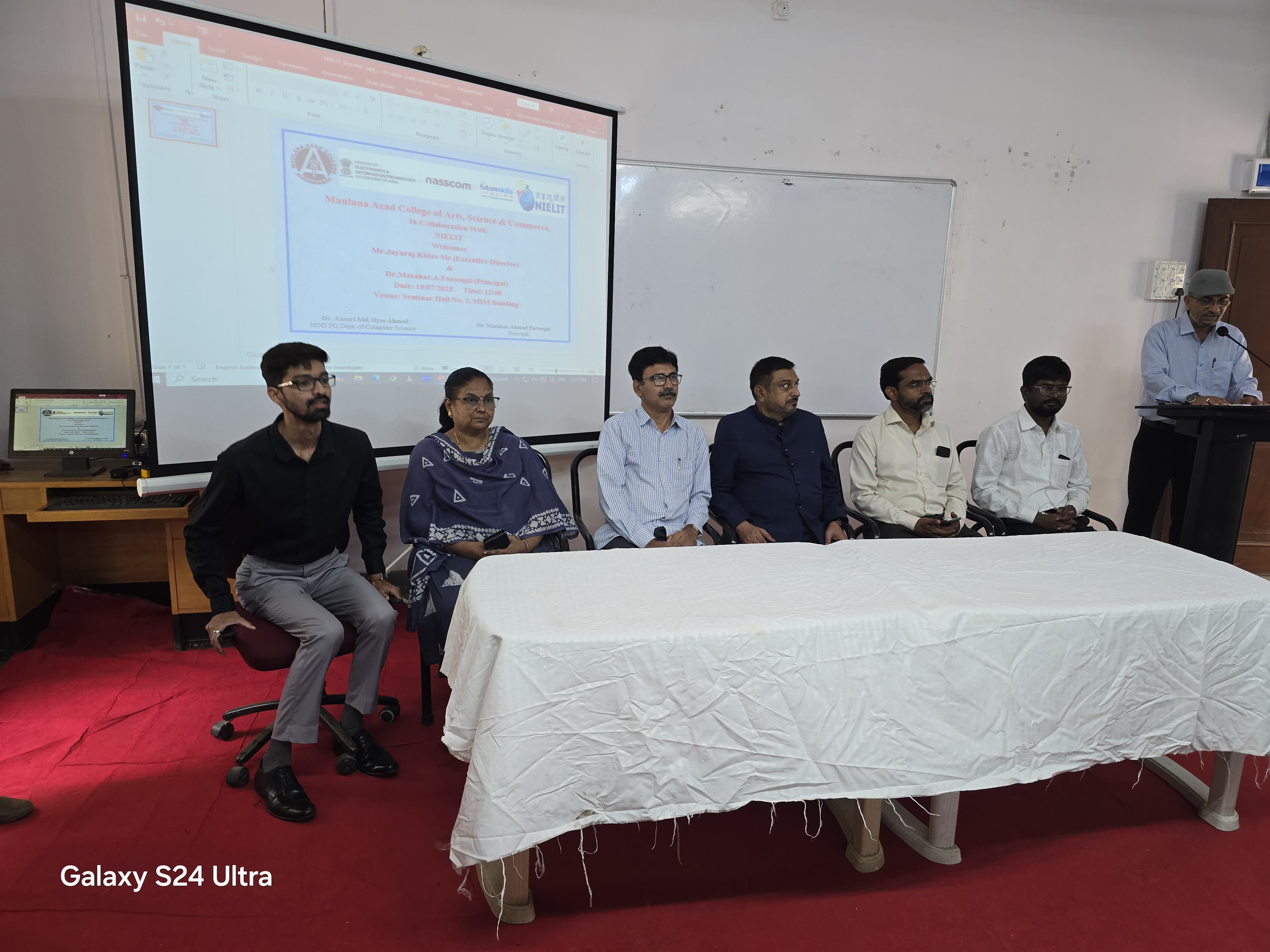 Under the able guidance of Principal Dr. Mazahar A. Farooqui, the Robotic Process Automation (RPA) Course (G.O.I) for non-teaching staff was successfully completed on Friday, followed by the Certificate Distribution Ceremony held on Saturday, 19th July 2025. The event was graced by the presence of Mr. Jayaraj Kidav, Executive Director of NIELIT, as the Chief Guest, along with Dr. Mazahar A. Farooqui (Principal), Dr. Arif Ali Pathan (Vice Principal), and Dr. Aditi Bhattacharya (IQAC cordinator ). The course was conducted under the supervision of Dr. Ilyas Ansari, whose dedicated efforts played a vital role in its successful implementation. The non-teaching staff members expressed their heartfelt gratitude for this opportunity. On behalf of all non-teaching staff, Mr. Mohd Mumtaz extended sincere thanks to the Principal for initiating and supporting such a valuable training program. The ceremony concluded with a formal vote of thanks delivered by Mr. Ashok Dange.