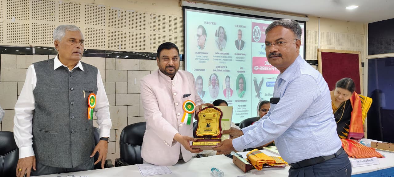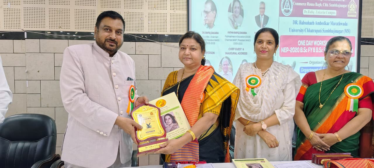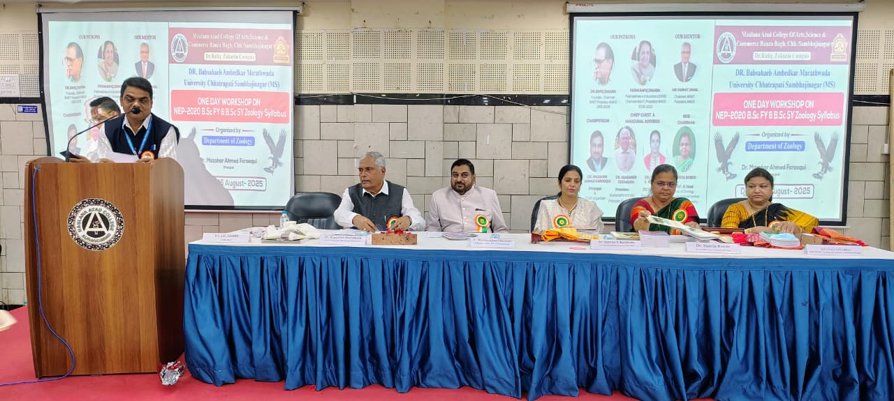 The Department of Zoology, Maulana Azad College, in collaboration with Dr. Babasaheb Ambedkar Marathwada University, Chh.Sambhajinager successfully organized a one-day workshop on the National Education Policy (NEP) 2020, focusing on the B.Sc.F.Y. & S.Y. Zoology syllabus. Here are the key highlights [No search results]: - Speakers: - (Inaugural Address) - Dr. Aparna S. Kalawate, Scientist E, Zoological Survey of India, Pune ( Chief Guest) - Dr. Abasaheb Deshmukh, President, Maharashtra State Principal Federation, Pune. ( Guest of Honor) - Prof. Sunita Borde, BOS Chairman and Professor & Head, Department of Zoology, Dr. BAMU ( In presence of) - Prof..Vidya Pradhan Vice Principal, Dr.R.Z.C.W. Aurangabad - Key Sessions: - Presidential address by Principal Dr. Mazhar Ahmed Farooqui - Three technical sessions successfully conducted during the Workshop *Book Released Ceremony: 8 Text book and Practical books released with the hands of Principal Dr.Mazhar Ahmed Farooqui, Principal Dr.Abasaheb Deshmukh, Dr.Aparna Kalawate Scientist E, ZSI,Pune