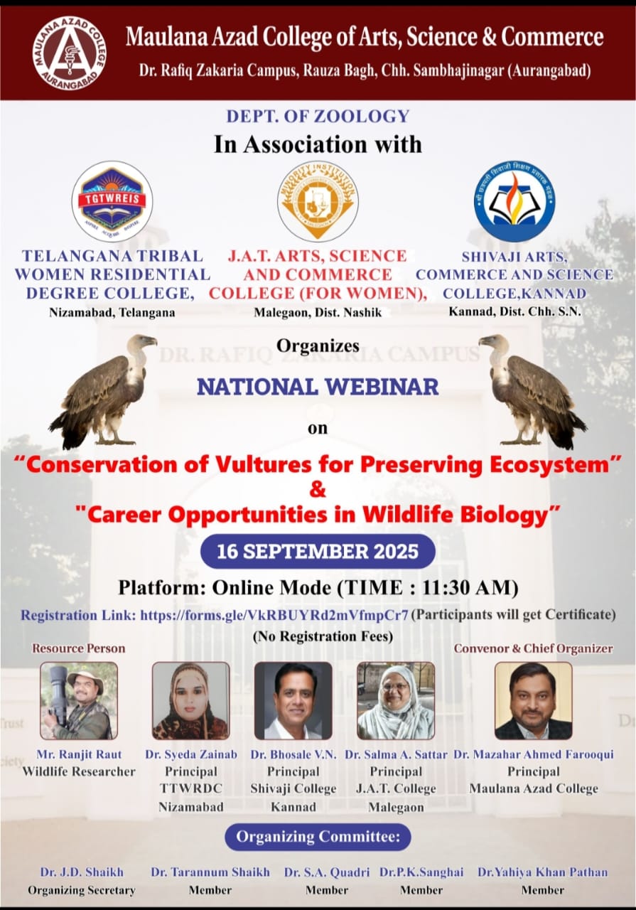 National Webinar on Vulture Conservation and Wildlife Biology Maulana Azad College of Arts, Science and Commerce, in collaboration with three other institutions, successfully organized a National Webinar on "Conservation of Vultures for Preserving Ecosystem & Career Opportunities in Wildlife Biology" on September 16, 2025. *Key Highlights - Resource Person: Mr. Ranjit Raut, a renowned Wildlife Researcher, delivered a comprehensive lecture on vulture conservation and career opportunities in wildlife biology. - Presidential Address: Dr. Mazahar Ahmed Farooqui, Principal of Maulana Azad College, welcomed participants and highlighted the importance of vulture conservation. - Panel of Principals: Dr. Salma A. Sattar, Dr. Syeda Zainab, and Dr. V.N. Bhosale shared their insights and expertise on the topic. *Collaborating Institutions under MoU: - Telangana Tribal Women Welfare Residential Degree College, Nizamabad - J.A.T. Arts, Science and Commerce College (For Women), Malegaon - Shivaji Arts, Commerce and Science College, Kannad *Organising committee: 1. Dr.J.D.Shaikh, Organising Secretary 2. Dr.P.K.Sanghai- Member 3. Dr.Pathan Yahiya Khan- Member 4. Dr.Tarannum Shaikh - Member 5. Dr.Syed Atheruddin Quadri- Member *Webinar Details - Date: Sept.16, 2025 - Time: 11:30 AM - Platform: Google Meet - *744 Participants registered online from Various places of India. - 200 participants attended live from Nizamabad. *Outcomes: The webinar provided a valuable platform for discussion, knowledge sharing, and networking among participants.