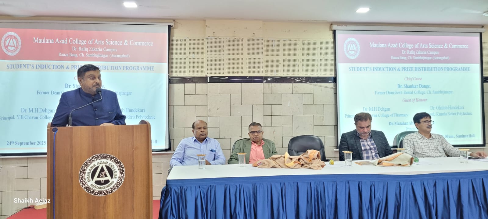 Maulana Azad College Launches Five-Day Induction Program for BBA & BCA Freshers Maulana Azad College kickstarted a five-day Induction Program for BBA and BCA students with an inaugural session featuring Chief Guest Dr. Shankar Dange, Former Dean, Govt. Dental College, Aurangabad and Guests of Honour Principal Dr. M. H. Dehgan and Principal Dr. Ghalib Hundekari. The program was presided over by Principal Dr. Mazahar Ahmed Farooqui. Certificates were awarded to achievers from the Skill Development Centre, and toppers of over 115 competitive exams conducted by Competitive Exam Guidance Cell were felicitated by the Competitive Exam Guidance Cell. The event was attended by faculty, staff, and students, and coordinated by senior faculty members.