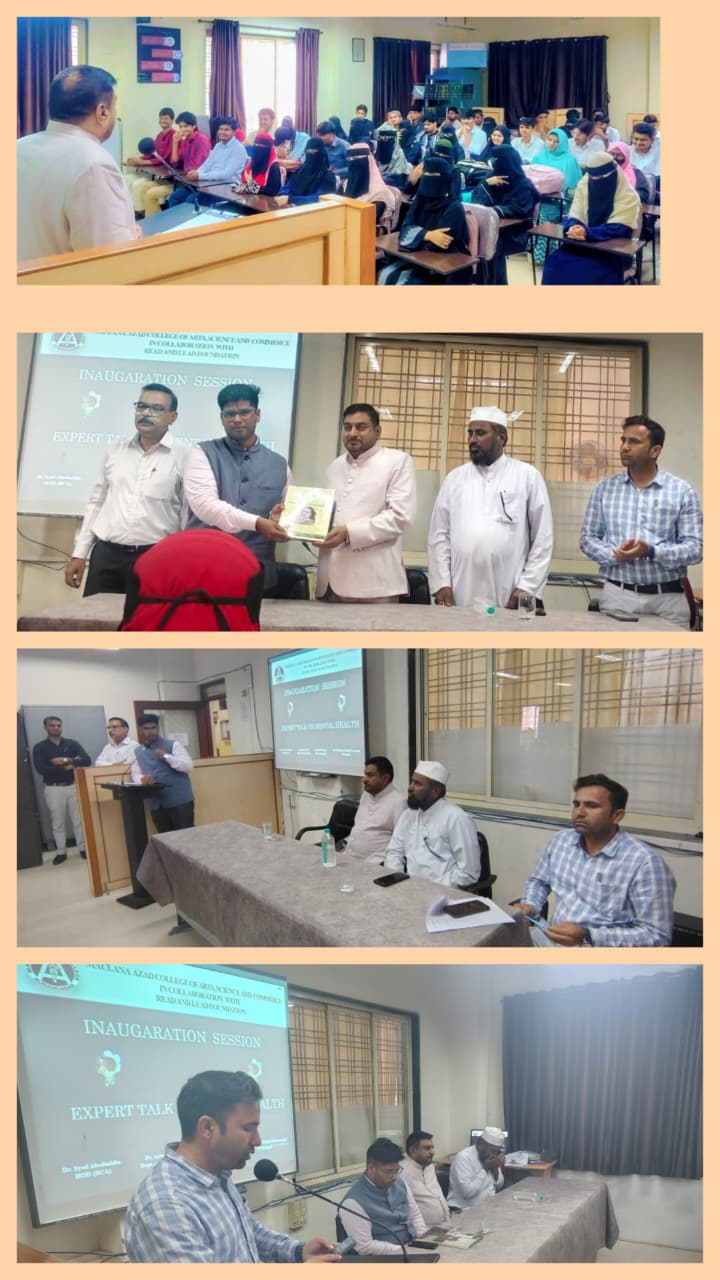 Maulana Azad College Aurangabad have organized a Mental Health Awareness Program under Principal Dr. Mazhar Ahmed Farooqui's guidance, following Supreme Court and AICTE directives. Key highlights include: - Expert Session: Mr. Mirza Abul Hasan Ali, District Consultant, UNICEF Chhattisgarh, led an informative session on mental health awareness. - Program Coordination: Dr. Syed Abeduddin played a key role in organizing the event. - Vote of Thanks: Dr. Azhar Patel expressed gratitude to the guest, participants, and organizers. Dr. Mazhar Ahmed motived the students for Stong Mental Health. This initiative demonstrates the college's commitment to student well-being and mental health, aligning with national directives.
