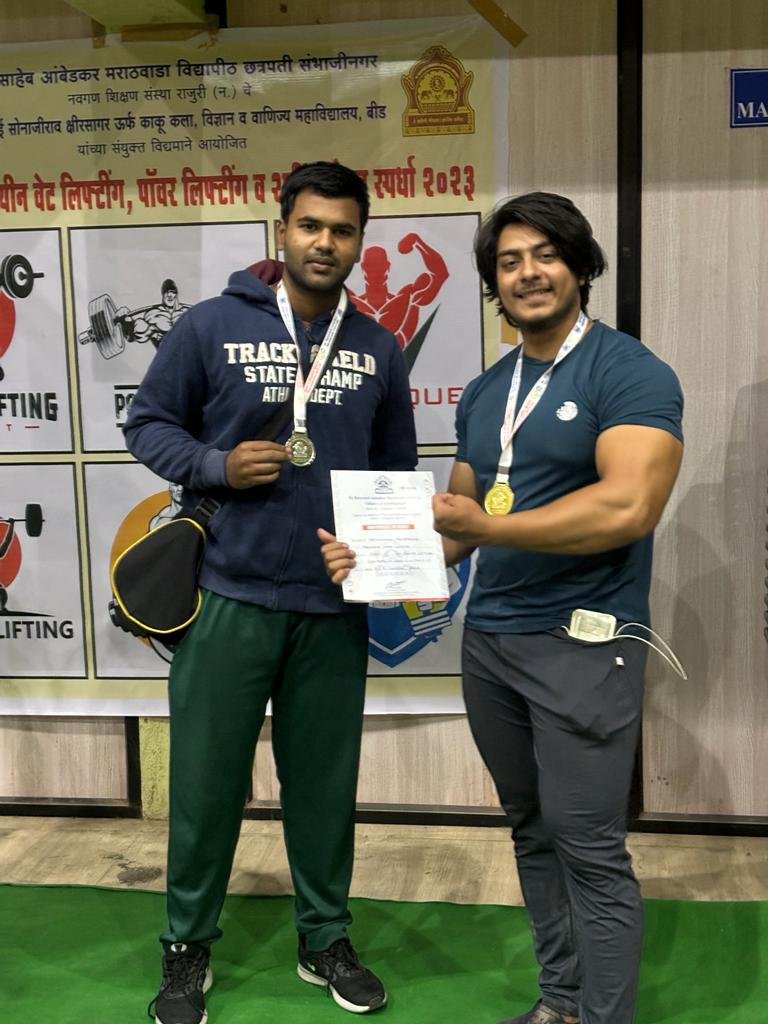 Senior college lifters and body building Won 3 Gold and 1 silver medal in DR BAMU ICT weight lifting,power lifting,and best physique tournament at BEED District 1) Mohammad Moinuddin BBA1st Gold medal in Power lifting BBA 1st 2) Fareed Khan won Gold medal in Best physique Bec 3rd 3)Shahnoor shaikh B.A 1st Won the Gold medal in Best physique Mohammad Moinuddin BBA1st won silver medal in best physique and selected to all Undia inter university tournament 2023