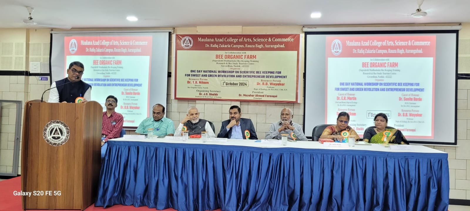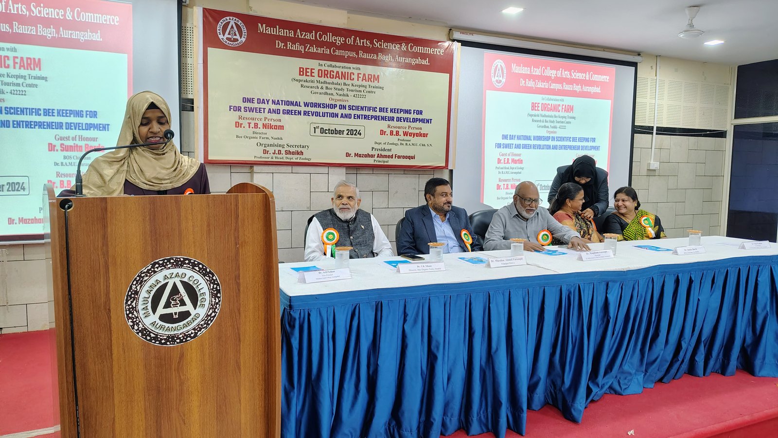 National Workshop on Scientific Beekeeping* Maulana Azad College, Aurangabad* October 1, 2024 The Department of Zoology, Maulana Azad College, Aurangabad, organized a one-day national workshop on scientific beekeeping for sweet and green revolution and entrepreneur development. The event was held in collaboration with Bee Organic Farm (Suprakriti Madhushala) Training, Research, and Bee Study Tourism Centre, Govardhan, Nashik, under a Memorandum of Understanding (MoU). Keynote Speakers and Sessions - Dr. T.B. Nikam: Techniques of honey extraction and bee communication (short film) - Dr. B.B. Waykar (Professor, Dr. Babasaheb Ambedkar Marathwada University): Importance of bee therapy