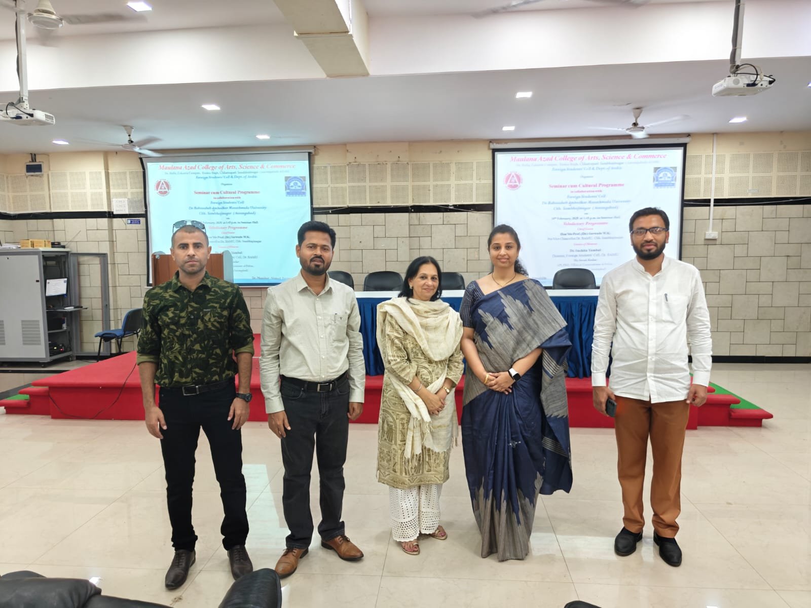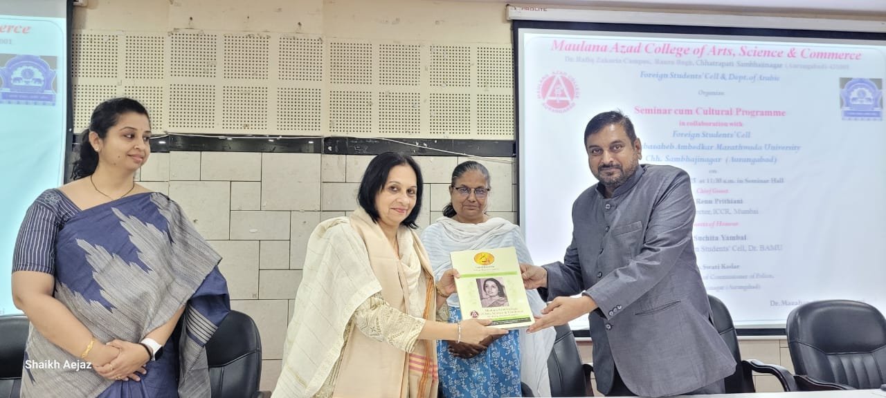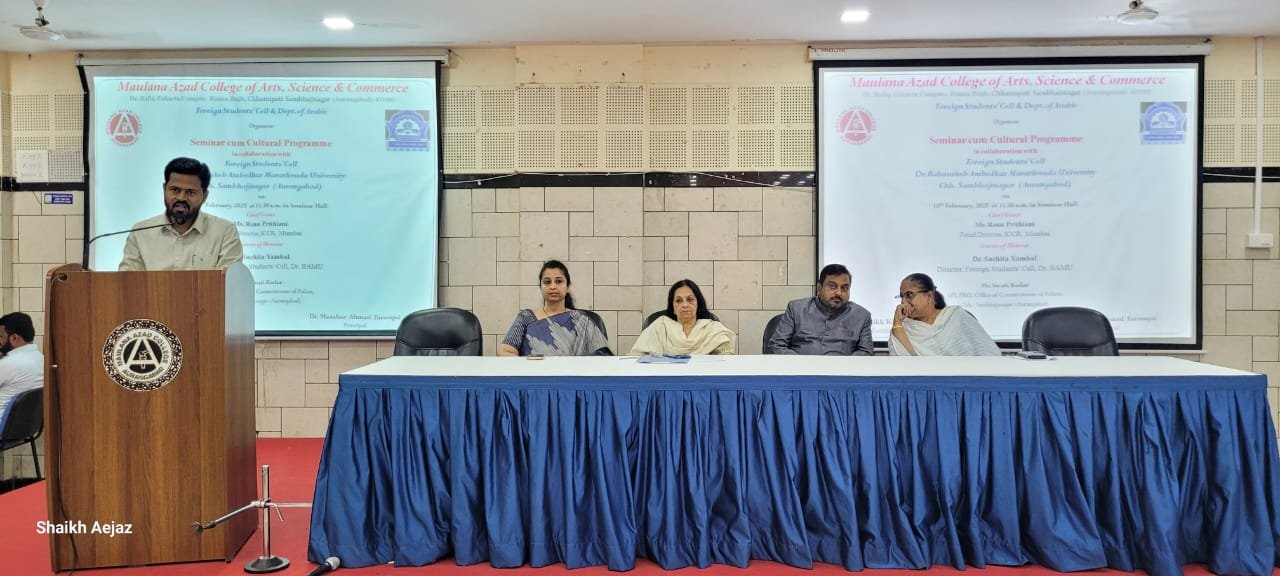 Maulana Azad College organizes National Seminar cumCultural Programme Foreign Students’ Cell of Maulana Azad College in collaboration with Foreign Students’ Cell of Dr. Babasaheb Ambedkar Marathwada University organizedNational Seminar in Arabic and Cultural Programme of Foreign Students on 10/02/2025 under the guidance of Principal Dr. Mazahar Farooqui.Hon’ble Pro-Vice-Chancellor Prof. (Dr) Walmik K. Sarwade has inaugurated the seminar and guided extensively to the participants with his scholarly thoughts. Ms. Renu Prithiani, Zonal Director, ICCR, Regional Office in Mumbai was the chief guest for cultural programme. She elaborated on the ICCR sponsored scholarships including the fellowship programmesto the foreign students.Dr. Suchita Yambal, Director, FRC, Dr. B. A. Marathwada University explained the university guidelines for foreign students in detail whereas Ms. Swati Kedar, API, FRRO, Office of Commissioner of Police, Chhatrapati Sambhajinagar focused the rules and regulations applicable to foreign students in her informative speech. Maulana Dr. Abdul Rasheed Madani, formerly Head Department of Arabic, Sir Sayyed College spoke on the Arabic literature extensively.Principal Dr. Mazahar Farooqui highlighted the initiatives of cell and guided the audience through his presidential remarks. Dr. Shaikh Kalimoddin,Incharge of the cell conducted the proceedings of the event whereas Dr. Abdul Ahad proposed the vote of thanks. Dr. Aditi Bhattacharya, Dr. Aparna Saraf, Dr. Shaikh Aakhil, Khan Sohail and other the teaching faculty attended the programme and contributed to its success.