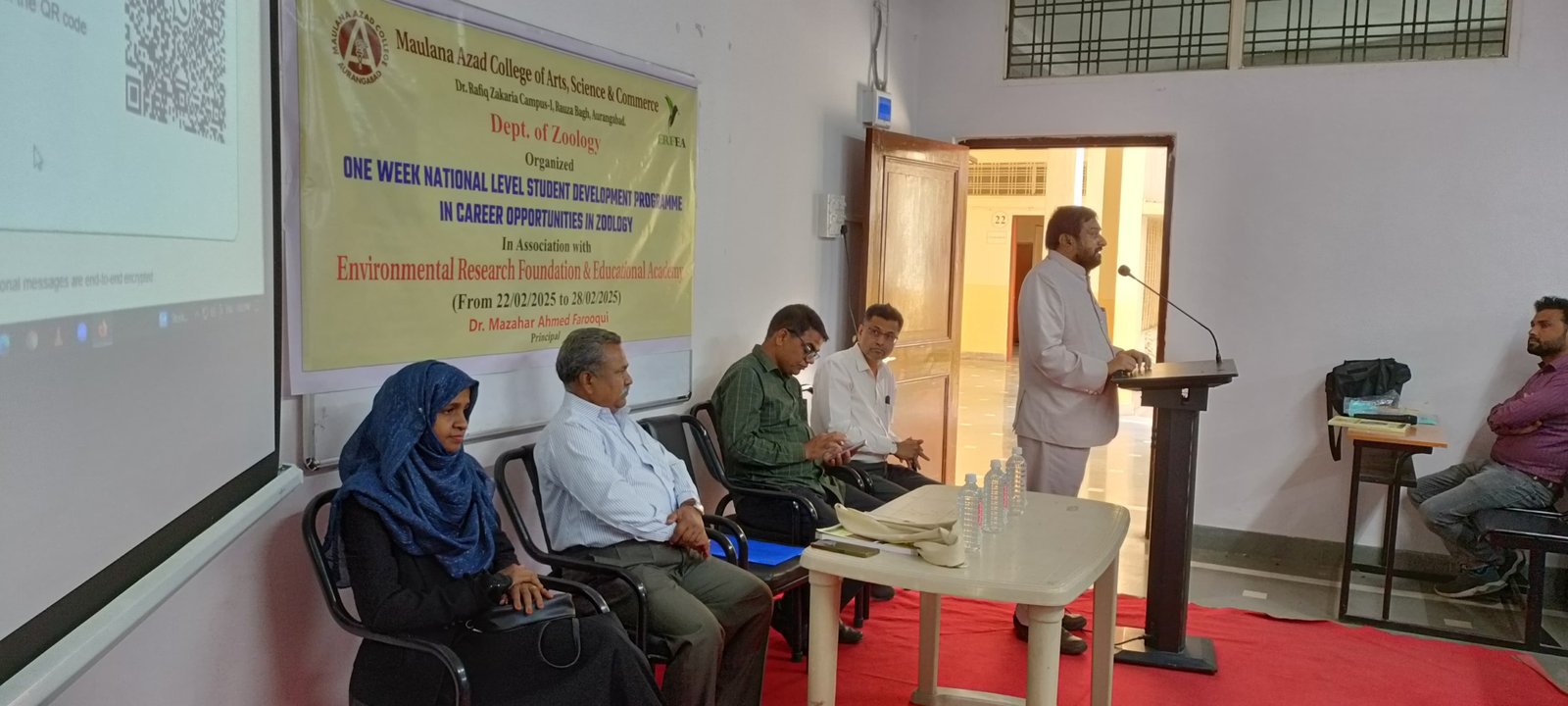 Maulana Azad College Aurangabad Hosts One week National Student Development Program on Career Opportunities in Zoology Department of Zoology, Maulana Azad College of Arts, Science & Commerce, Aurangabad organized One Week National Student Development Program for undergraduate and postgraduate students. On the occasion of National Science Week, focused on "Career Opportunities in Zoology. February 22 to 28, 2025, was organized by the Department of Zoology in association with Environmental Research Foundation & Educational Academy (ERFEA) and TTWRDCLSW, Nizamabad, Telangana. It will be conducted in hybrid mode, featuring demonstrations (offline) followed by an e-quiz. Participants will receive certificates upon completion.The first session of the program was inaugurated by Prof C.J.Haiware, former head Department of Zoology, Dr.B.A.M.U. The keynote speaker, Prof. C.J. Hiware, delivered an insightful talk on "Sericulture Applications.""Dr. Shaikh Tarannum , Organizing Secretary, introduced the guest, while Dr. Syed Ather Quadri conducted the program. Principal and Chairman of the Program Dr. Mazahar Farooqui delivered the presidential address. Prof. J.D. Shaikh, Head of the Department of Zoology, proposed the vote of thanks. Dr Syeda Zainab, Principal TTWRDCLSW , and Nizamabad were joined the session online. 78 students attended offline, and 186 students joined online modes for the first session of the NSDP. This initiative aimed to provide students with a comprehensive understanding of career opportunities in zoology and equip them with the necessary skills and knowledge to excel in their chosen fields.