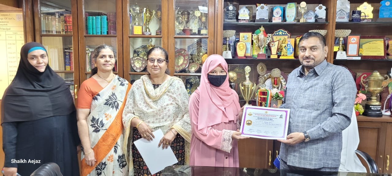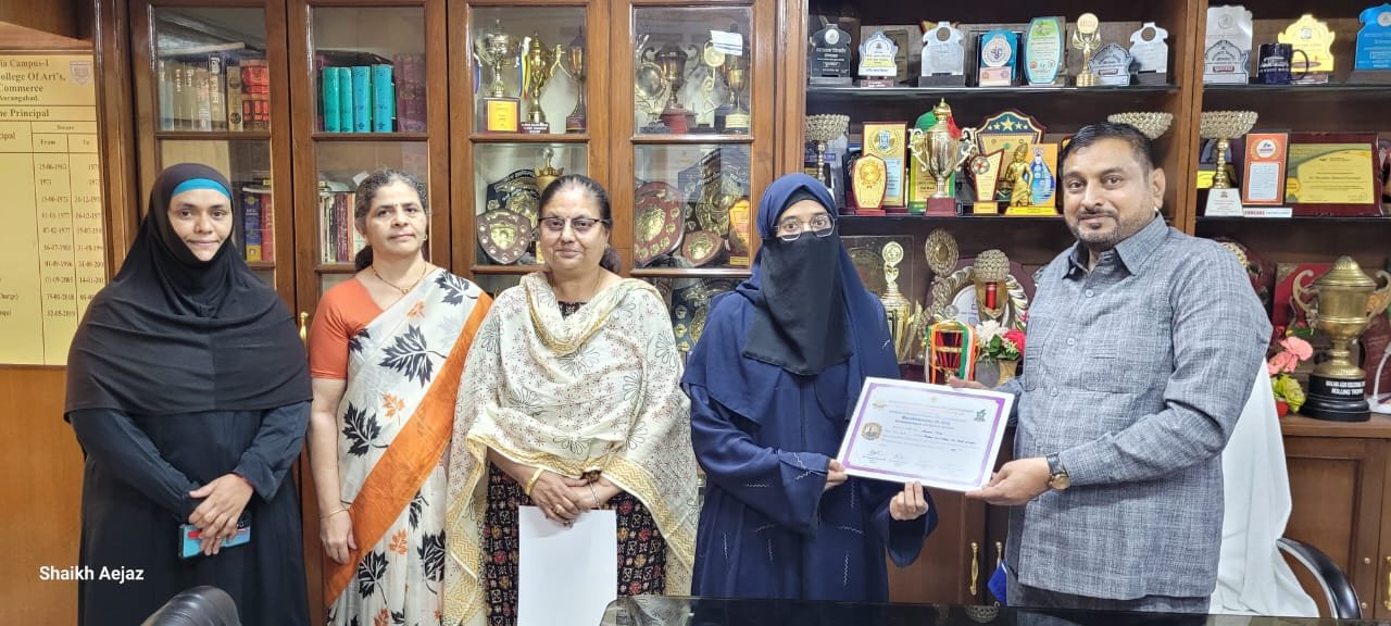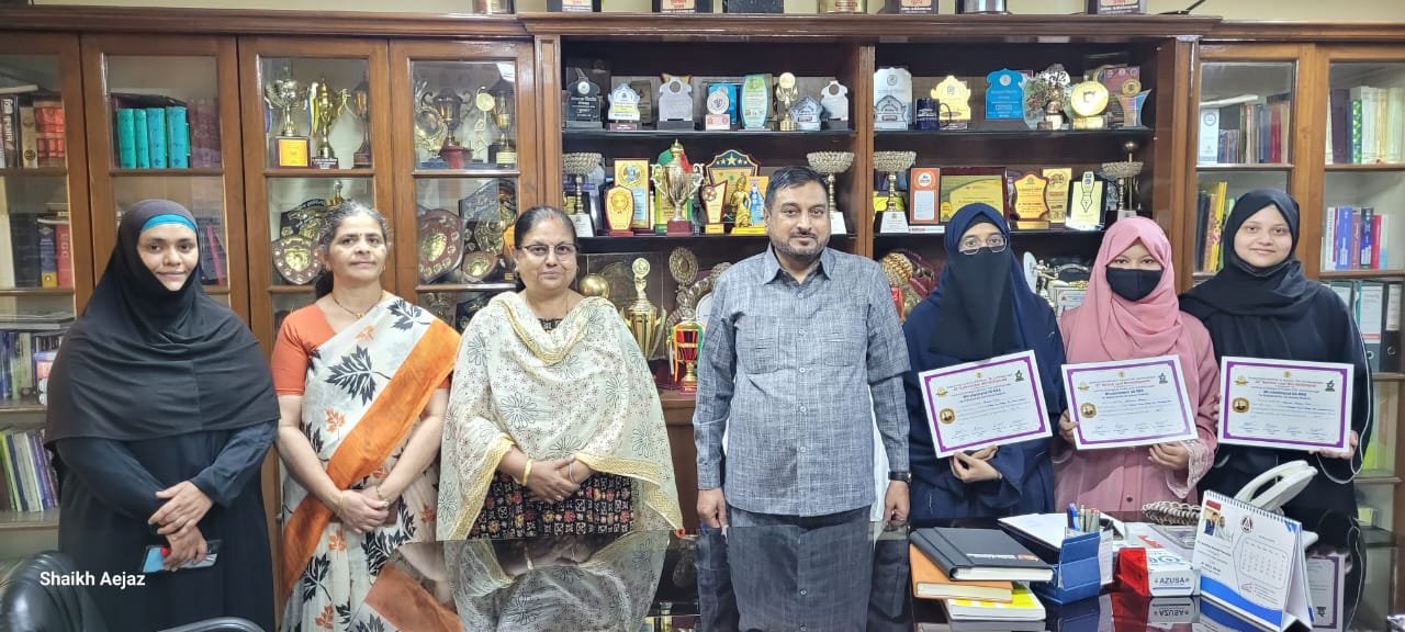 We are immensely proud to announce the wonderful performance of our First Year Microbiology students at the National Micrbiolympiad! Competing against 70 colleges nationwide in the first round, our team ( Ms.Ayesha Zareen,Ms.Amena Rida, Ms.Naushaba Ayman) secured an impressive 7th position. The second round, held at the prestigious Government Institute of Science, Aurangabad, saw our team rise to the challenge once again. Against the top most qualifying teams from across India, our students achieved a commendable 6th place! This achievement is a testament to the hard work, dedication, and intellectual curiosity of our budding microbiologists. Their diligent attendance at extra lectures and extensive study efforts have yielded good results. The Department of Microbiology extends its heartfelt congratulations to our students for their exceptional performance at the national level. We express our sincere gratitude to our esteemed Principal, Dr. Mazahar Ahmed Farooqui Sir, for his unwavering guidance, support, and encouragement, which have been instrumental in fostering the development of the students and staff of the college. We are particularly thankful for his gracious felicitation of the students, recognizing their remarkable achievement.