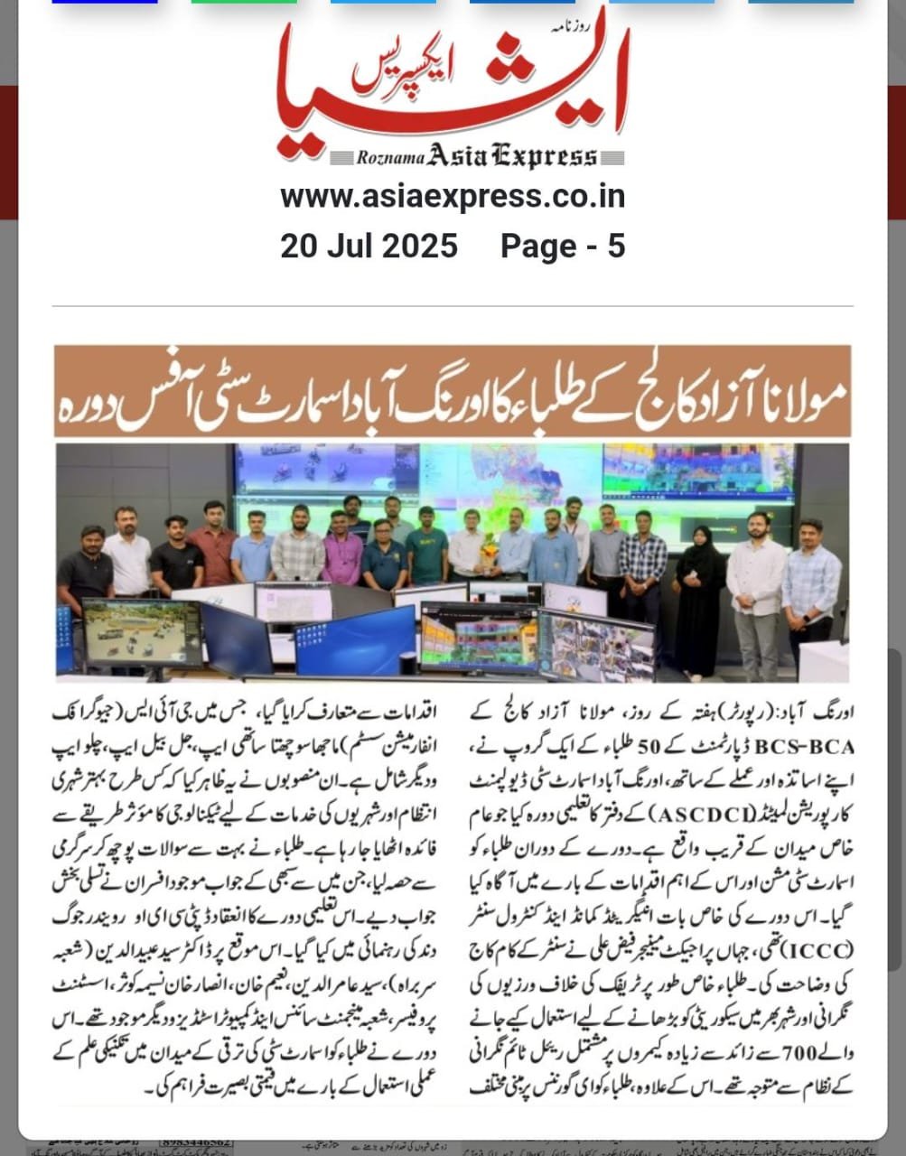 Study Tour: Smart City Command and Control Center, Aurangabad Under Principal Dr. Mazahar Ahmed Farooqui's esteemed leadership and adhering to AICTE guidelines, the Department of BCA-BCS organized a study tour to explore "Real-time Applications and IT Solutions" at Aurangabad Smart City's Central Command and Control Center. 45 students have participated alongwith 5 teachers : Mr. Amer, Miss Naseema Mr. Naim, Mr. Ansar, and Mr. Irfan were present. The visit, monitored by H.O.D. Dr. Syed Abeduddin, provided students with practical exposure to smart technologies and urban digital infrastructure and functioning of Integrated Command and Control Centre ICCC of Aurangabad Municipal Corporation and Smart City.