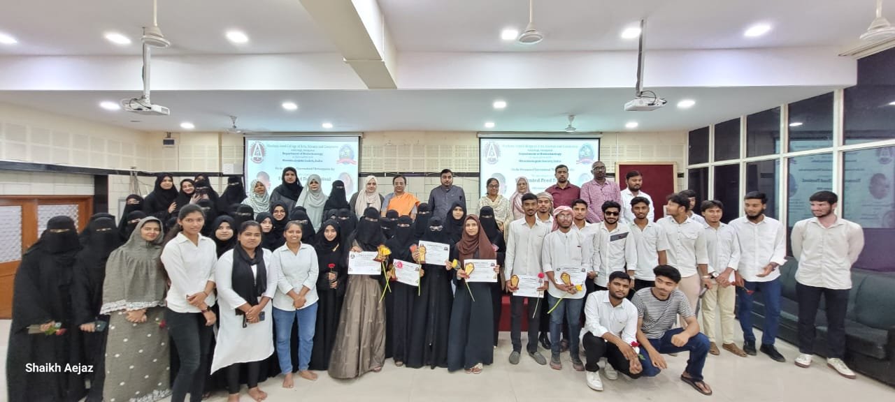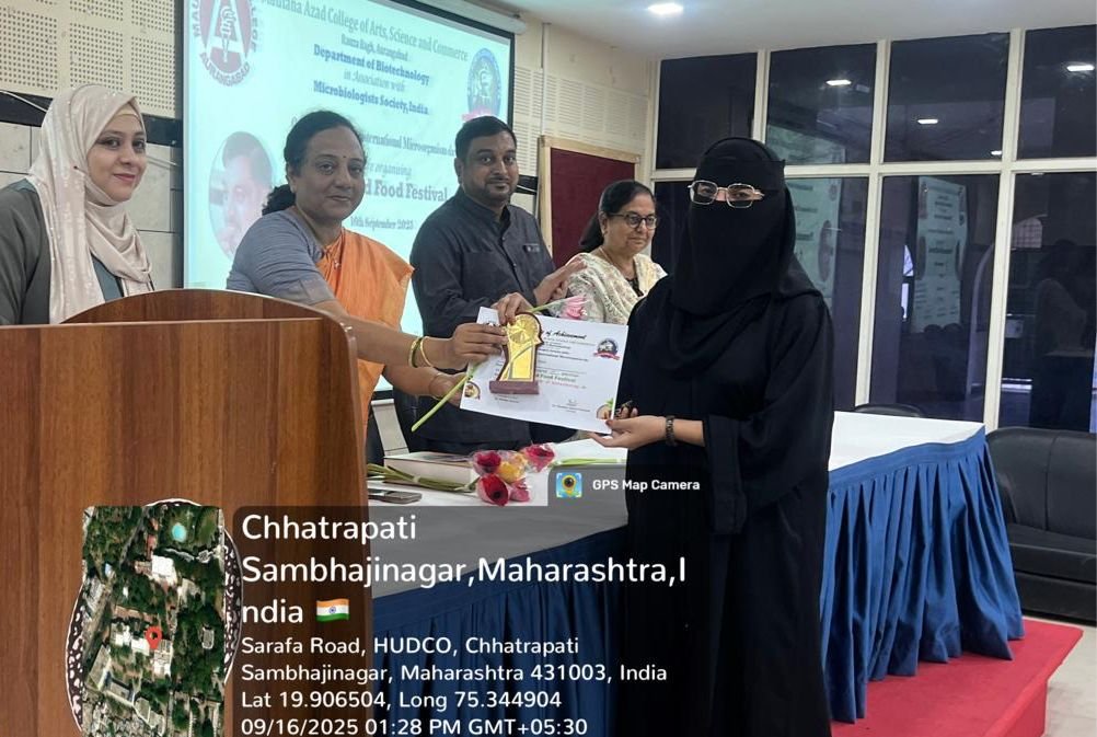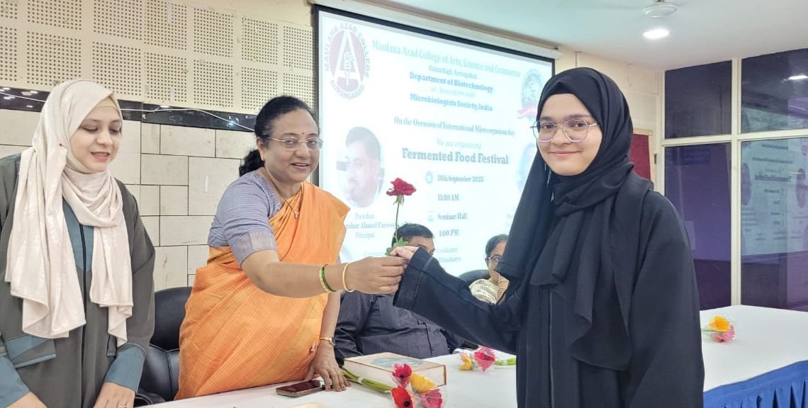 On the occasion of International Microorganism Day, the Department of Biotechnology, Maulana Azad College of Arts, Science and Commerce, Aurangabad, in association with the Microbiologists Society, India, organized a Fermented Food Festival on 16th September 2025. The event began at 11:30 AM in the Seminar Hall and continued with engaging sessions till 1:00 PM. The festival aimed to celebrate the crucial role of microorganisms in food, health, and culture, highlighting the fascinating science and tradition behind diverse fermented foods. The program was presided over by Dr. Mazahar Ahmed Farooqui, Principal of Maulana Azad College. Prof. Dr. Swati Peshwe, Department of Microbiology, Government Institute of Science, Aurangabad, graced the event as Chief Guest and Judge, and also conducted the prize distribution ceremony for the winners of the food festival competitions. A special highlight of the event was the welcome of B.Sc. Biotechnology First Year students, who were greeted warmly with roses as a gesture of encouragement and inclusion. The festival was convened by Dr. Reshma Jaweria (HOD, Department of Biotechnology) with the support of Dr. Aditi Bhattacharya (IQAC Coordinator), Dr. Arif Pathan (Vice Principal), and the dedicated teaching and non-teaching staff of the Biotechnology Department. This celebration not only showcased a wide variety of traditional and modern fermented food items but also emphasized their nutritional and probiotic value. It proved to be a unique blend of science, culture, and taste, fostering awareness about the beneficial roles of microbes in daily life.
