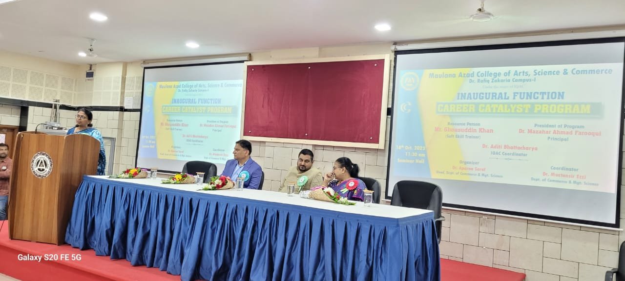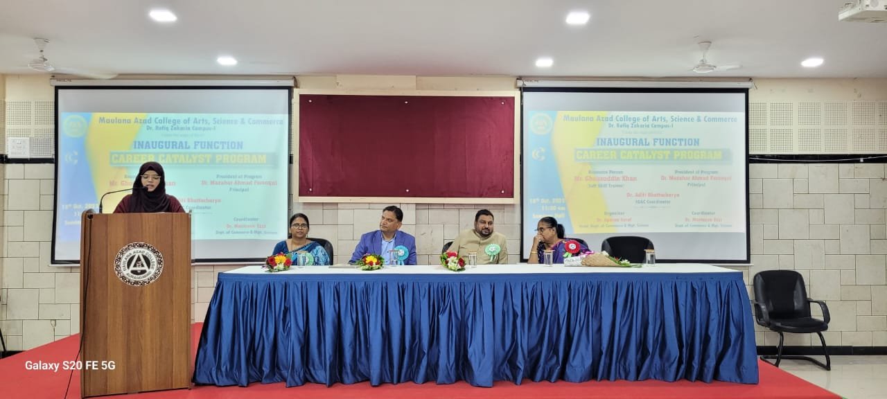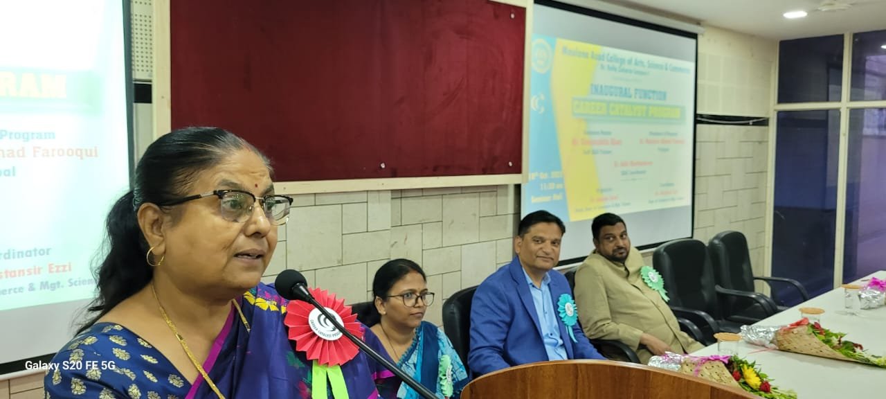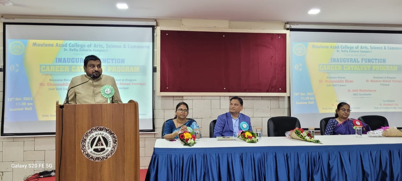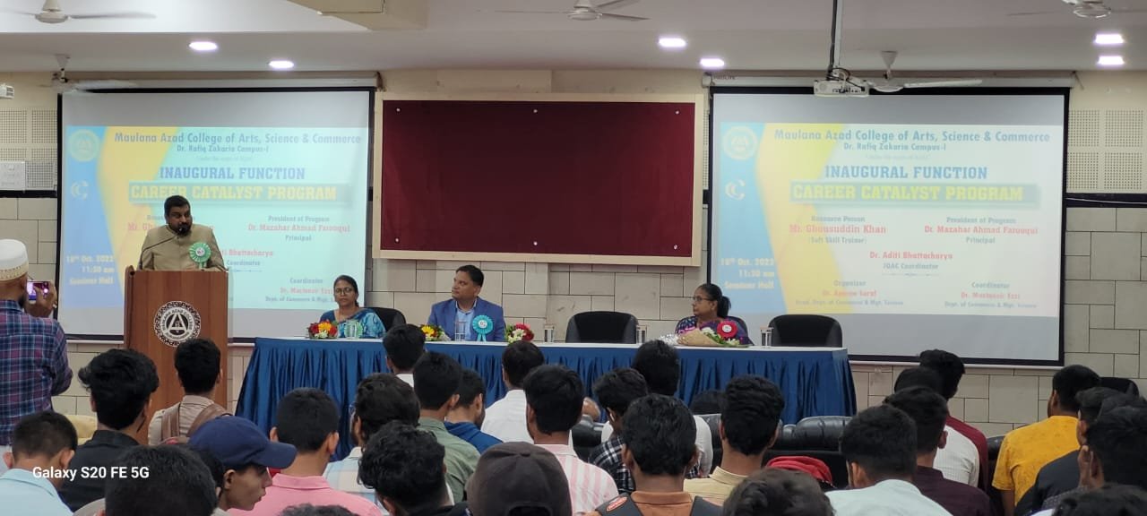 Principal Dr.Mazahar Farooqui addressing the students on Inauguration of Career Catalyst Programme organised by Dept.of Commerce and Mgt.Science. Mr.Ghousuddin Khan, Founder, Brain Dynamics, Hyderabad was the Guest and resource person for session-1: Pathfinder. Participating students enjoyed the activity based learning session.
